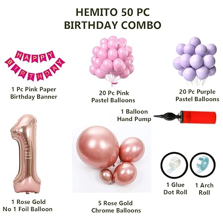 - Our Pink and Pastel Balloon Combo includes: Pink Paper Happy Birthday Banner, 40 Pc Premium Pink and Purple Pastel Balloons,5 Premium Rose Gold Chrome Balloons, No1 Rose Gold Foil Balloons( 16 inches) with Glue Dot Roll, Arch Roll, and Balloon Hand Pump Enough for a Birthday Decoration Kit